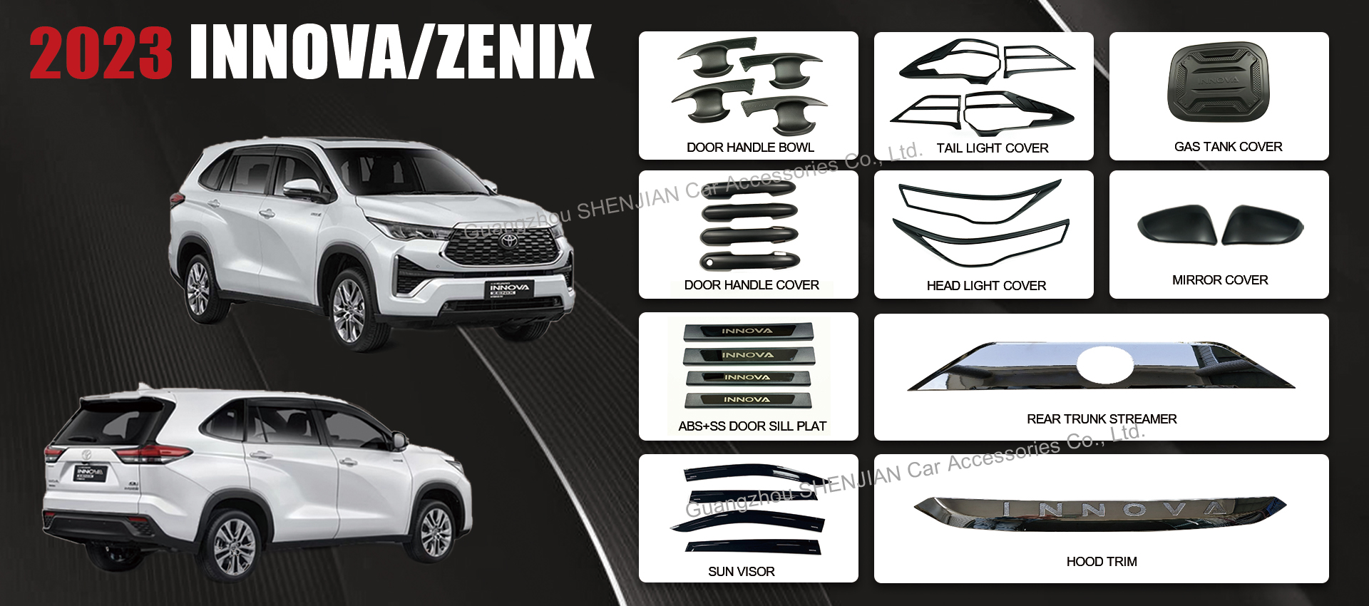 This new product suitable for Toyota Innova Zenix 2023 includes Car body kits garnish set, window visor, door sill scuff plate, rear trunk streamer and hood trim.The car body kit also includes headlight cover, tail light cover, door handle bowl, car handle cover, gas tank cover, and mirror cover.