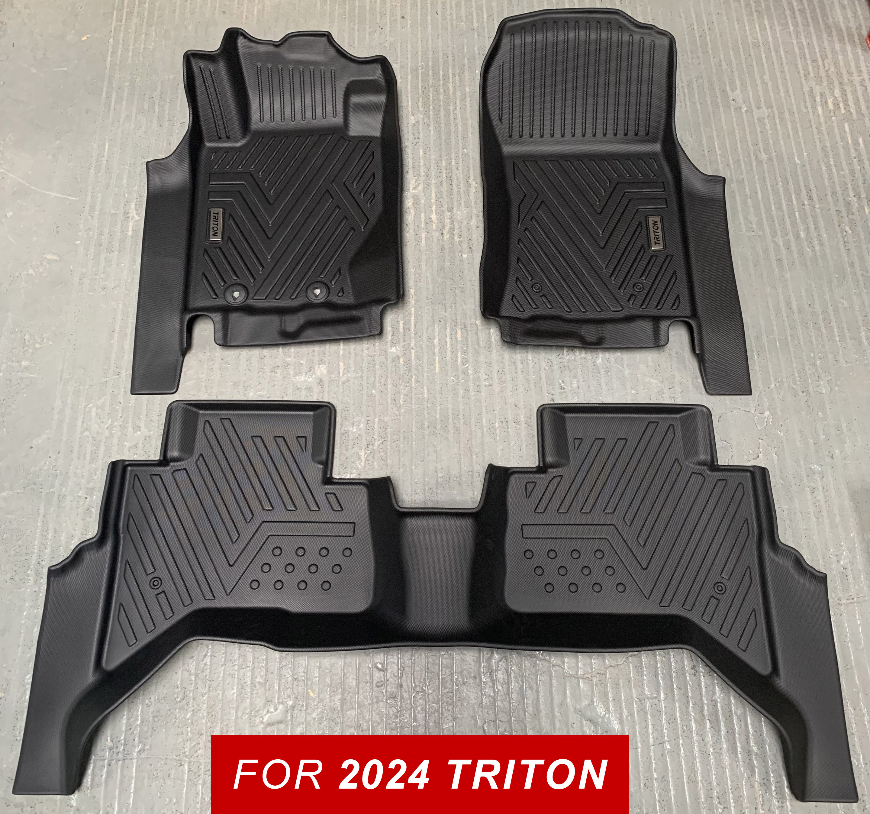 The 2024 Triton floor mats are available in both left-hand and right-hand drive versions, featuring a 5D design that fully covers the door sills, offering maximum protection for your car floor. These car mats can be customized with additional options like a carpet overlay for enhanced comfort.